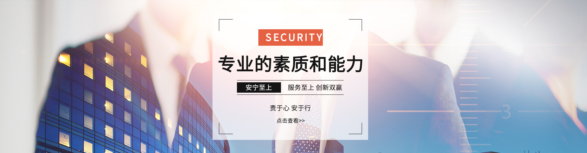 公司始終堅持“務實、求精、效益、創(chuàng)新”的質量方針,奉行“維護 雇主事業(yè)管理秩序,捍衛(wèi)雇主事業(yè)運營安全,致力于雇主事業(yè)長期發(fā)展的保駕護航”服務宗旨,不斷加強公司管理層和員工隊伍建設,以專業(yè)化、標準化的優(yōu)質高效的服務質量為各企事業(yè)單位提供專業(yè)的安全保衛(wèi)及物業(yè)管理服務。